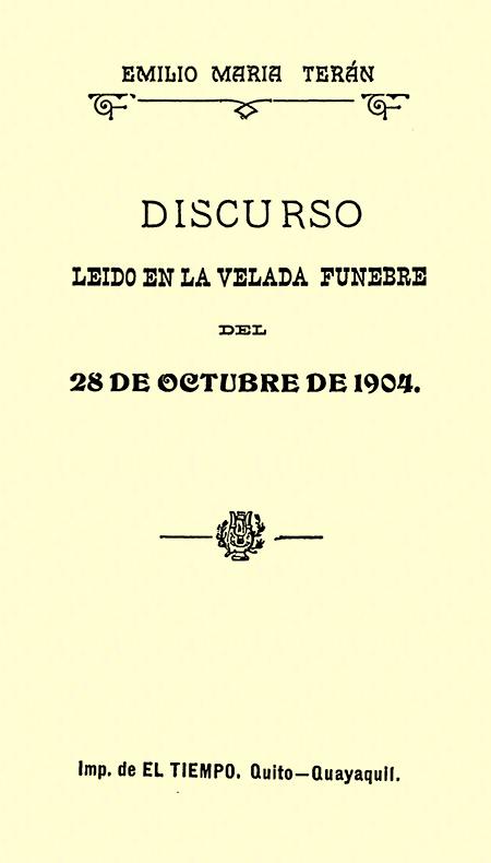Terán, Emilio María. 1904. Discurso leído en la velada fúnebre del 28 de octubre de 1904. Quito, Ecuador : Guayaquil, Ecuador : Imp. de El Tiempo.
