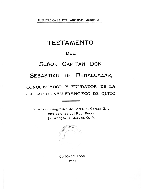 Jerves Machuca, Alfonso Antonio. 1935. Testamento del Señor Capitán Don Sebastián de Benalcázar, conquistador y fundador de la ciudad de San Francisco de Quito .Quito, Ecuador : Talleres Tipográficos Municipales.