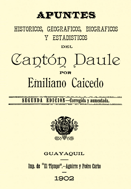 Caicedo, Emiliano. 1902. Apuntes históricos, geográficos, biográficos y estadísticos del Cantón Daule. Segunda edición - corregida y aumentada. Guayaquil, Ecuador : Impr. de "El Tiempo" - Aguirre y Pedro Carbo.