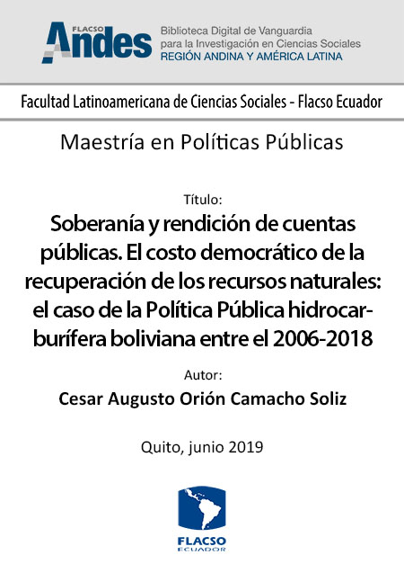 Orión Camacho Soliz, Cesar Augusto. 2019. Soberanía y rendición de cuentas públicas. El costo democrático de la recuperación de los recursos naturales: el caso de la Política Pública hidrocarburífera boliviana entre el 2006-2018. Tesis de maestría, Flacso Ecuador.