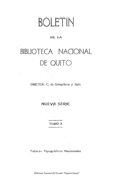 Gangotena y Jijón, Cristobal. 1926. Boletín de la Biblioteca Nacional de Quito. V2. N8. Quito. Talleres Tipográficos Nacionales. 78 p.