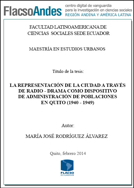 Bedoya, M. E. (2014). La representación de la ciudad a través de radio - drama como dispositivo de administración de poblaciones en Quito (1940-1949) (Tesis de Maestría en Estudios Urbanos). FLACSO Sede Ecuador, Quito.