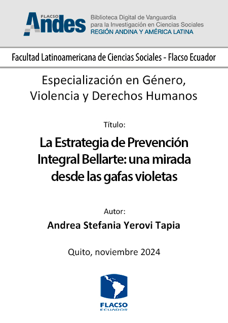 Yerovi Tapia, Andrea Stefania. 2024. La Estrategia de Prevención Integral Bellarte: una mirada desde las gafas violetas. Tesina de especialización, Flacso Ecuador.