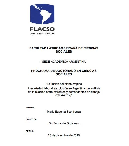 Sconfienza, María Eugenia (2016). La ilusión del pleno empleo : precariedad laboral y exclusión en la Argentina : un análisis de la relación entre oferentes y demandantes de trabajo, 2004 - 2012. Tesis de Doctorado. FLACSO. Sede Académica Argentina, Buenos Aires.