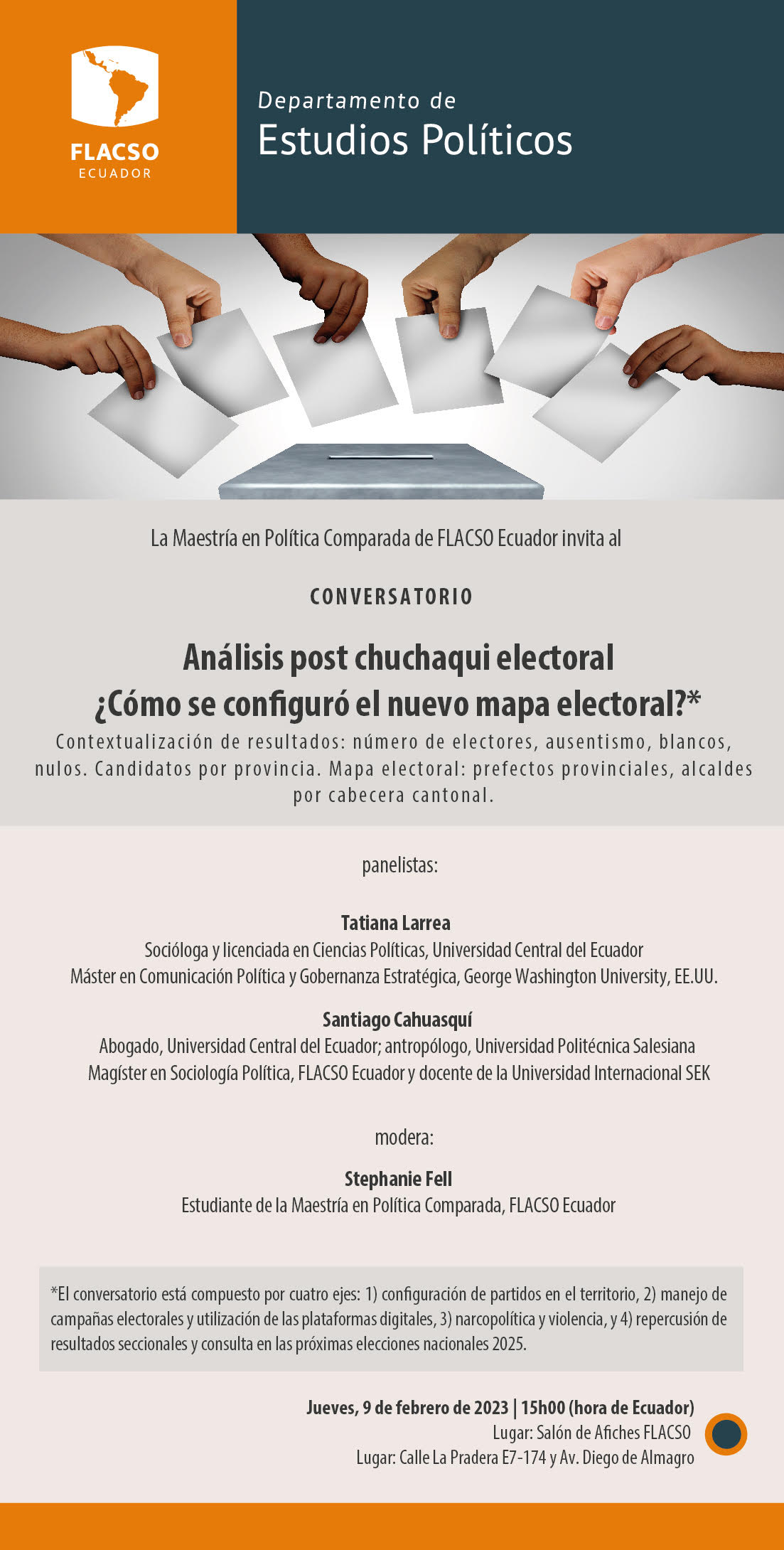 Maestría en Política Comparada FLACSO Ecuador - Conversatorio Análisis post chuchaqui electoral ¿Cómo se configuró el nuevo mapa electoral? Jueves 9 de febrero de 2023 - 15h00 - FLACSO Ecuador, Quito. Con la participación de Santiago Cahuasquí - Abogado, Universidad Central del Ecuador; antropólogo, Universidad Politécnica Salesiana Magíster en Sociología Política, FLACSO Ecuador y docente de la Universidad Internacional SEK y Tatiana Larrea Socióloga y licenciada en Ciencias Políticas, Universidad Central del Ecuador Máster en Comunicación Política y Gobernanza Estratégica, George Washington University, EE.UU.