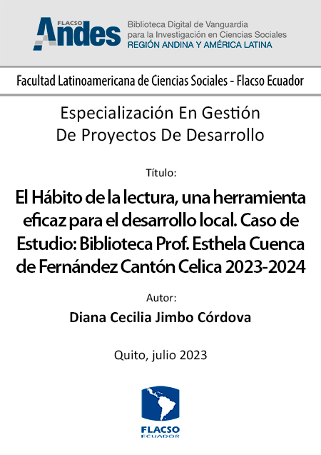 Jimbo Córdova, Diana Cecilia. 2024. El Hábito de la lectura, una herramienta eficaz para el desarrollo local. Caso de Estudio: Biblioteca Prof. Esthela Cuenca de Fernández Cantón Celica 2023-2024. Tesina de especialización, Flacso Ecuador.