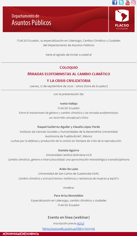 La Facultad Latinoamericana de Ciencias Sociales (FLACSO Ecuador) y el Centro de Investigación para el Desarrollo Internacional (IDRC-CRDI) tiene el agrado de invitar a usted al Coloquio Miradas ecofeministas ante el cambio climático y la crisis civilizatoria, 17 de septiembre de 2020, a cargo de Arlén de León, con el tema: Cambio climático y Extractivismos: resiliencia y resistencia de mujeres q´eqchi´s.