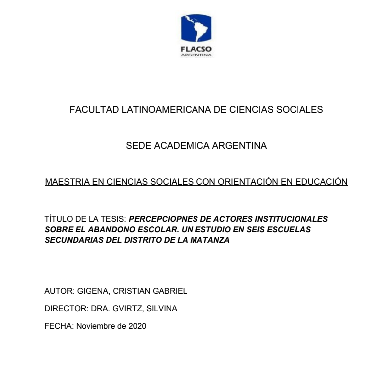 Gigena, Cristian Gabriel. (2020). Percepciones de actores institucionales sobre el abandono escolar : un estudio en seis escuelas secundarias del distrito de La Matanza. Tesis de Maestría. FLACSO. Sede Académica Argentina, Buenos Aires.