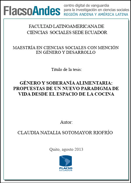 Sotomayor, C. N. (2013). Género y soberanía alimentaria : propuestas de un nuevo paradigma de vida desde el espacio de la cocina (Tesis de Maestría en Ciencias Sociales con mención Género y Desarrollo). FLACSO Sede Ecuador, Quito.