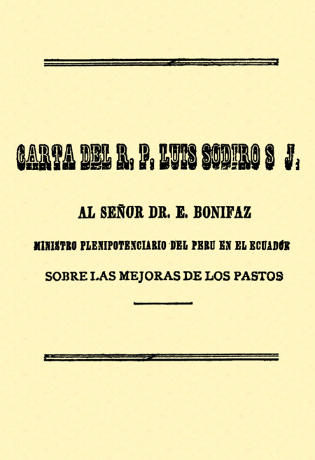 Sodiro, Luis. [1888]. Carta del R, P. Luis Sodiro S. J. al señor Dr. E. Bonifaz Ministro Plenipotenciario del Perú en el Ecuador, sobre las mejoras en los pastos. [Quito, Ecuador] : [Editorial sin identificar].