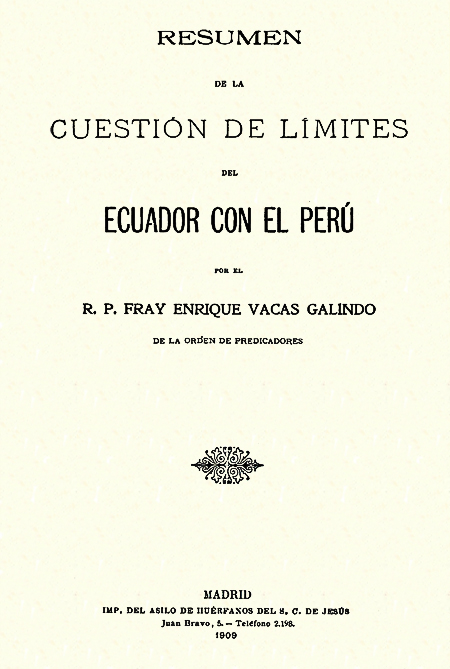 Vacas Galindo, Enrique. 1909. Resumen de la cuestión de límites del Ecuador con el Perú. Madrid, España : Imp. del Asilo de Huérfanos del S. C. de Jesús.