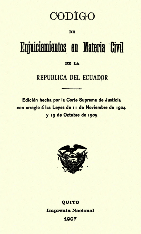 1907. Código de enjuiciamientos en Materia Civil de la República del Ecuador : Edición hecha por la Corte Suprema de Justicia con arreglo a las leyes de 11 de noviembre de 1904 y 19 de octubre de 1905. Quito, Ecuador : Imprenta Nacional.