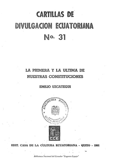 Uzcategui, Emilio. 1981. Cartilla de divulgación ecuatoriana No. 31. La primera y la última de nuestras constituciones. Quito, Ecuador : Casa de la Cultura Ecuatoriana.