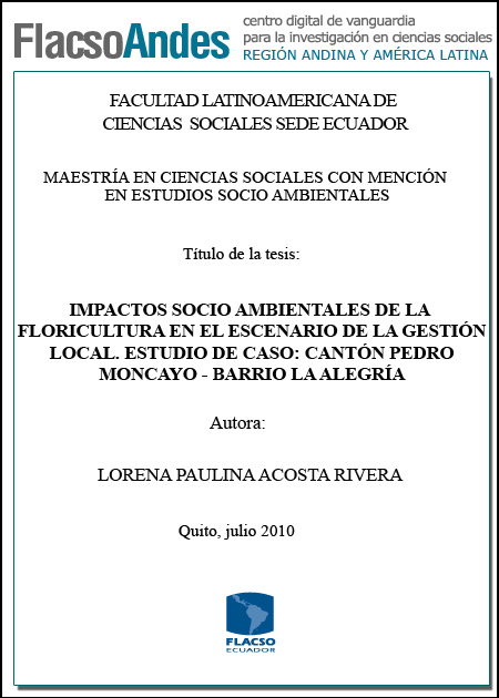 Acosta Rivera, Lorena Paulina (2010). Impactos socio ambientales de la floricultura en el escenario de la gestión local. Estudio de caso : cantón Pedro Moncayo - Barrio la Alegría. Maestría en Ciencias Sociales con mención en Estudios Socio Ambientales; FLACSO Sede Ecuador. Quito. 110 p.