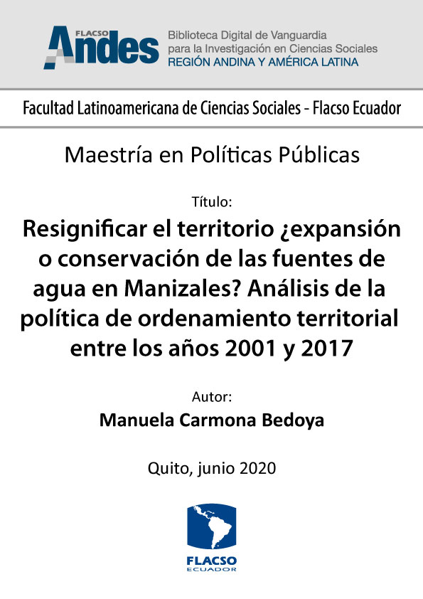 Carmona Bedoya, Manuela. 2020. Resignificar el territorio ¿expansión o conservación de las fuentes de agua en Manizales? Análisis de la política de ordenamiento territorial entre los años 2001 y 2017. Tesis de maestría, Flacso Ecuador.