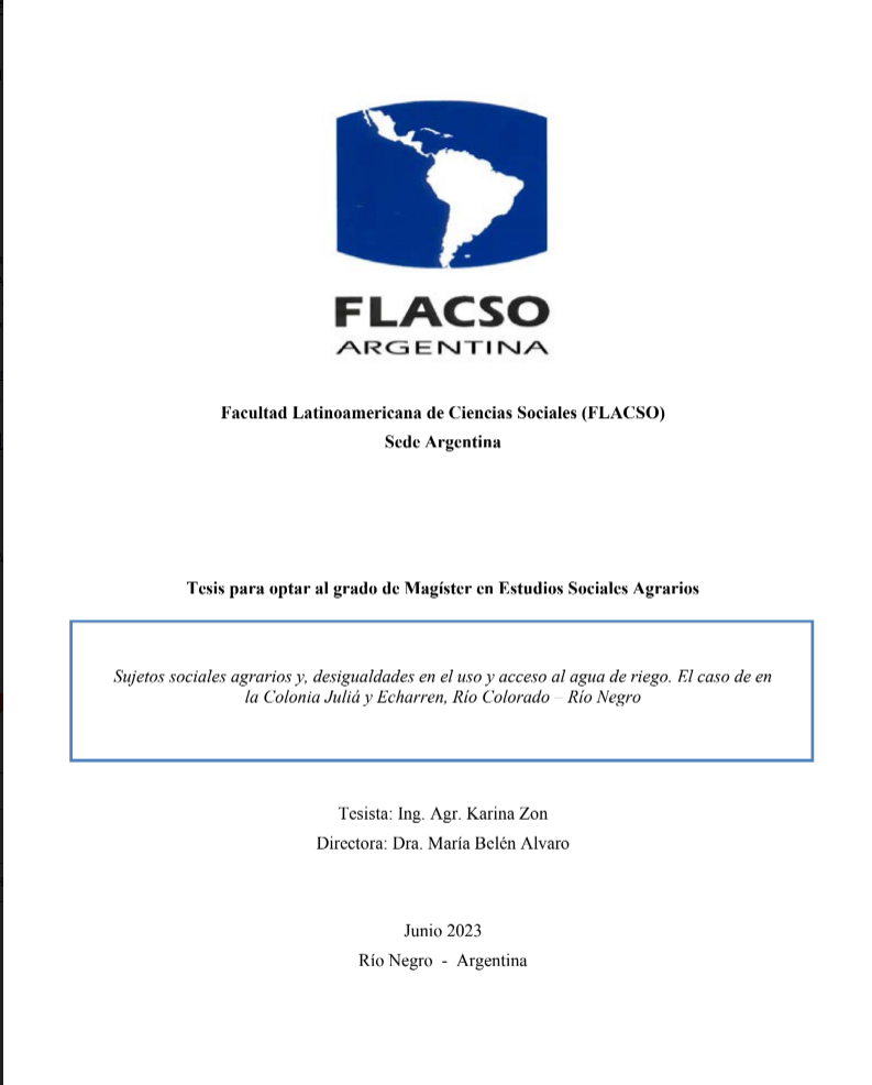 Zon, Karina Daniela (2023). Sujetos sociales agrarios y, desigualdades en el uso y acceso al agua de riego: el caso de en la Colonia Juliá y Echarren, Río Colorado – Río Negro. Tesis de Maestría. FLACSO. Sede Académica Argentina, Buenos Aires.
