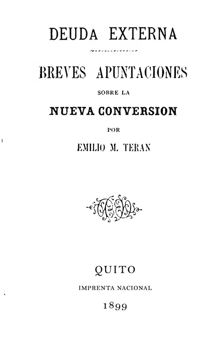 Terán, Emilio M. 1899. Deuda externa y Breves apuntaciones sobre la nueva conversión. Quito, Ecuador : Imprenta Nacional.