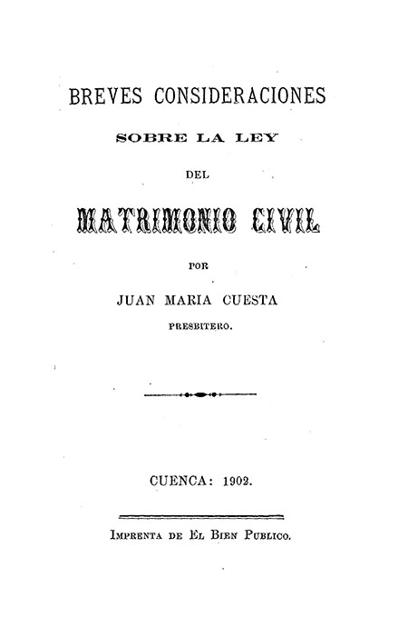 Cuesta, Juan María .1902. Breves consideraciones sobre la ley del matrimonio civil. Cuenca : Imprenta de El Bien Público.