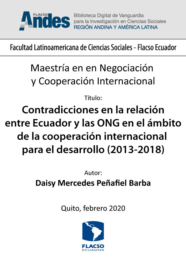 Peñafiel Barba, Daisy Mercedes. 2020. Contradicciones en la relación entre Ecuador y las ONG en el ámbito de la cooperación internacional para el desarrollo (2013-2018). Tesis de maestría, Flacso Ecuador.