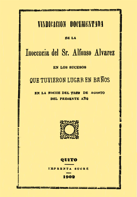 Alvarez V., Vicente. 1902. Vindicación documentada de la inocencia del Sr. Alfonso Alvarez en los sucesos que tuvieron lugar en Baños en la noche del tres de agosto del presente año. Quito, Ecuador : Imprenta Sucre.