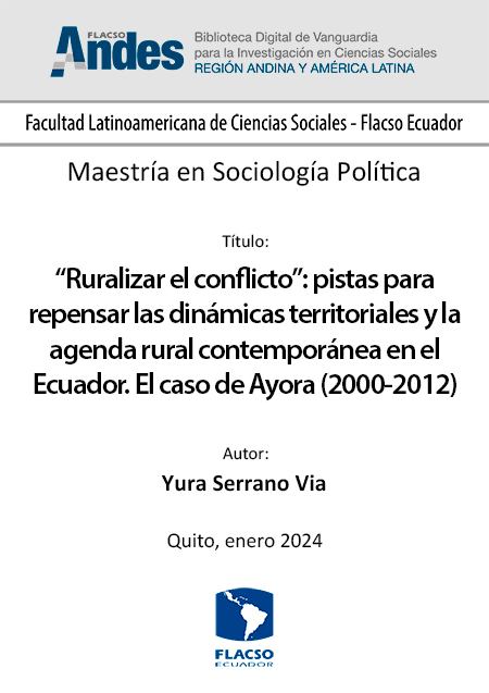 Serrano Via, Yura. 2024. “Ruralizar el conflicto”: pistas para repensar las dinámicas territoriales y la agenda rural contemporánea en el Ecuador. El caso de Ayora (2000-2012). Tesis de maestría, Flacso Ecuador.