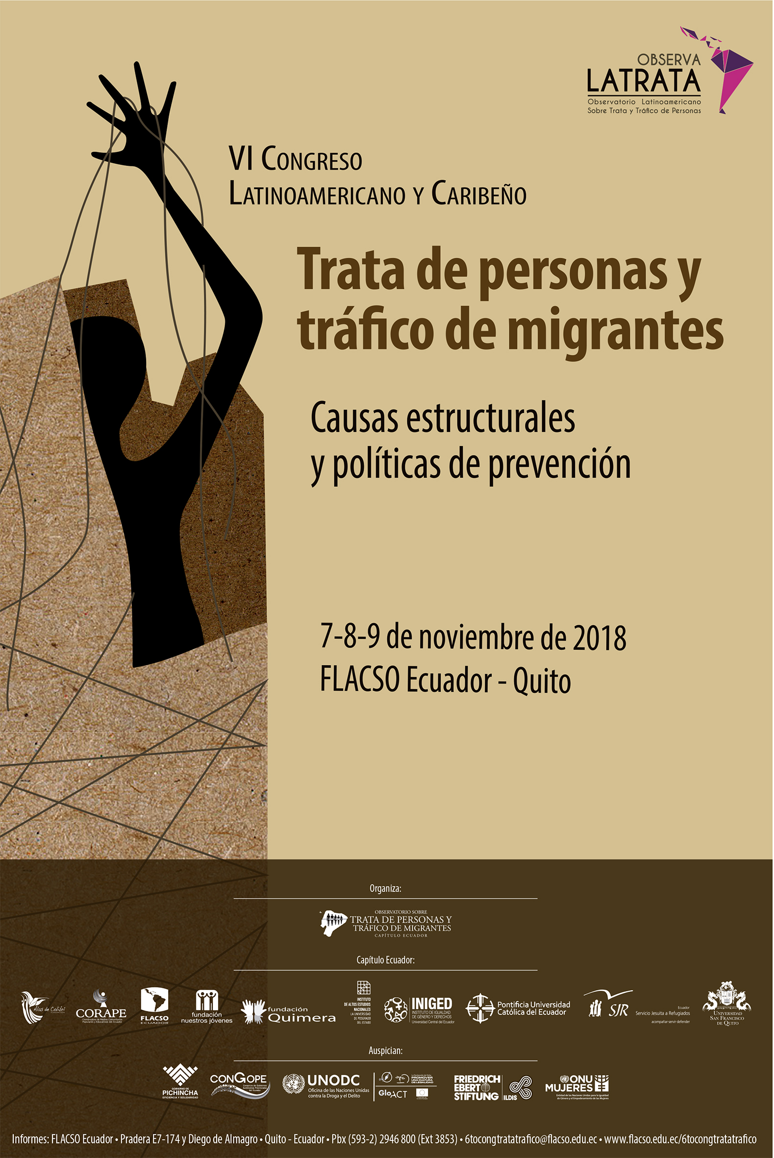 Afiche promocional del VI congreso “Trata de personas y tráfico de migrantes” causas estructurales y políticas de prevención, realizado del 7 al 9 de noviembre de 2018 en FLACSO Sede Ecuador con la colaboración de: OBSERVA LATRATA, ADC, CORAPE FNJ, FUNDACIÓN QUIMERA, IAEN, INIGED, PUCE, SIR, USFQ, GOBIERNO DE PICHINCHA, CONGOPE, UNODC, GIOACT, ILDIS, ONU- MUJERES.
