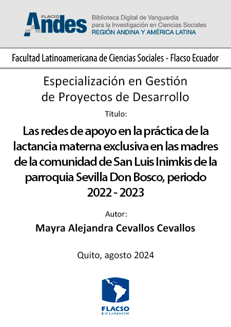 Cevallos Cevallos, Mayra Alejandra. 2024. Las redes de apoyo en la práctica de la lactancia materna exclusiva en las madres de la comunidad de San Luis Inimkis de la parroquia Sevilla Don Bosco, periodo 2022 - 2023. Tesina de especialización, Flacso Ecuador.