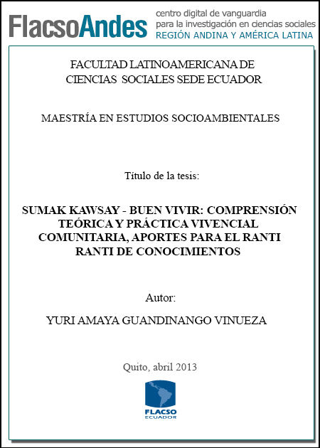 Guandinango Vinueza, Yuri Amaya (2013). Sumak kawsay - buen vivir : comprensión teórica y práctica vivenvial comunitaria, aportes para el ranti ranti de conocimientos. Maestría en Estudios Socioambientales; FLACSO Sede Ecuador. Quito, 147 p.