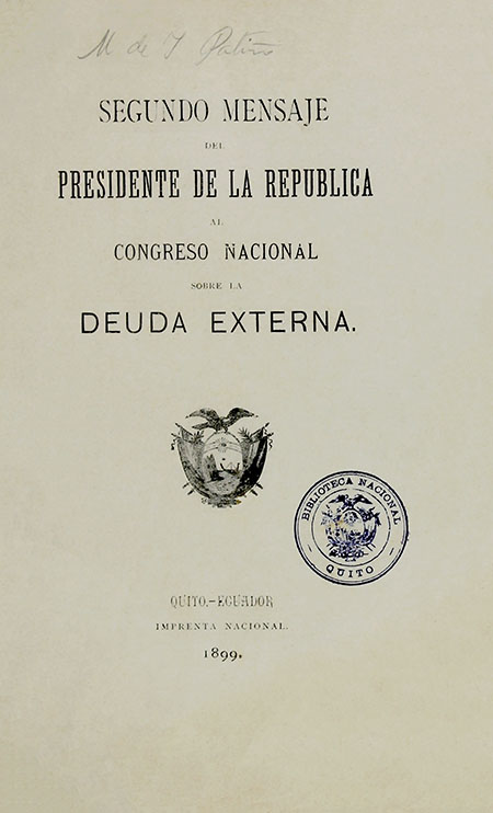 Alfaro, Eloy. 1899. Segundo Mensaje del Presidente de la República al Congreso Nacional sobre la Deuda Externa. Quito, Ecuador : Imprenta Nacional.