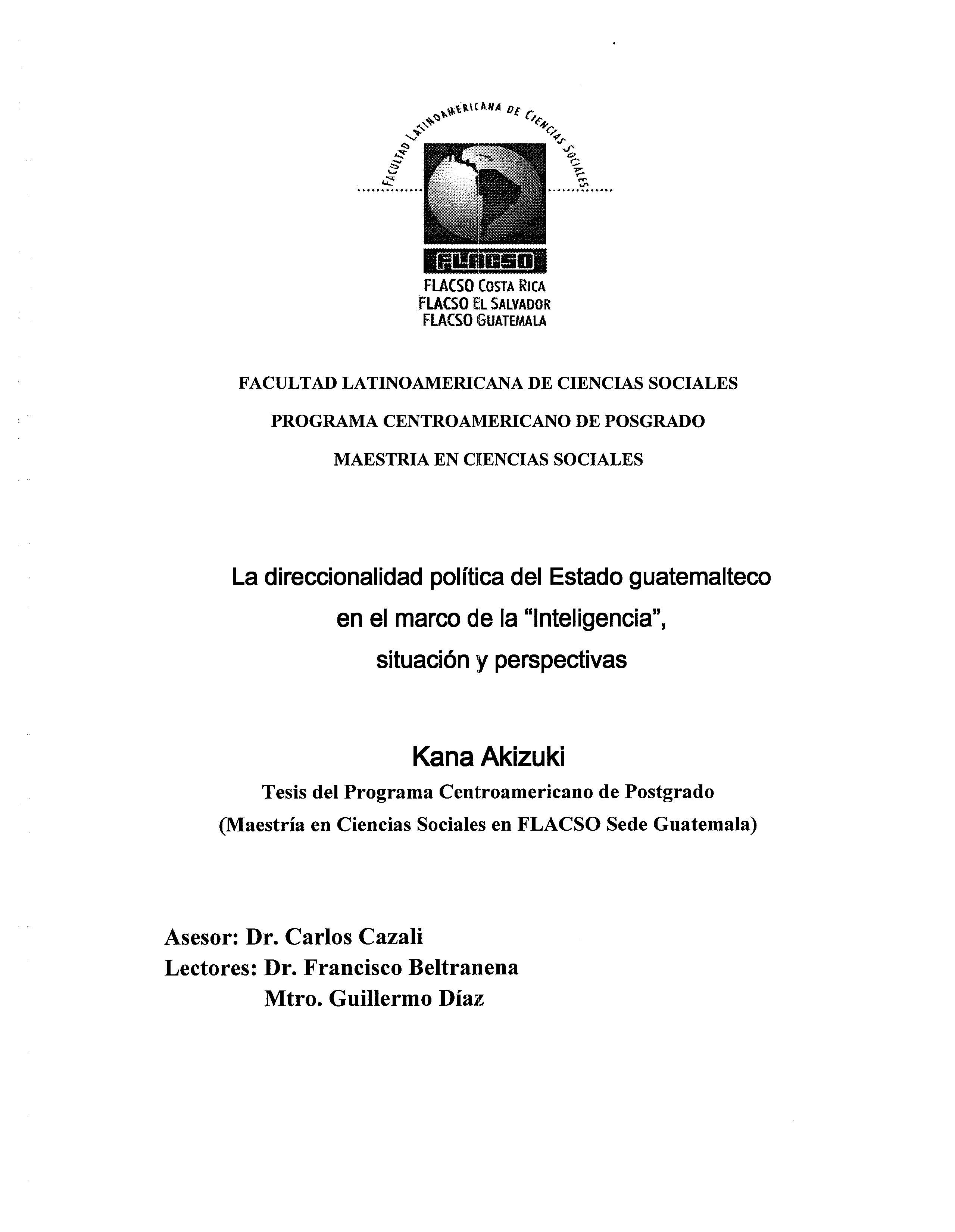 Akizuki, Kana (2003). La direccionalidad política del Estado guatemalteco en el marco de la inteligencia, situación y perspectivas. Maestría en Ciencias Sociales, FLACSO Programa Centroamericano de Postgrado. Guatemala. 175 p.