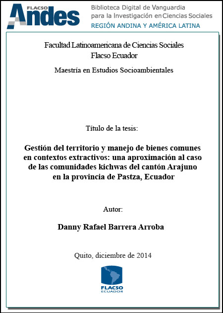 Barrera Arroba, Danny Rafael. 2014. Gestión del territorio y manejo de bienes comunes en contextos extractivos: una aproximación al caso de las comunidades Kichwas del cantón Arajuno en la provincia de Pastaza, Ecuador. Tesis de maestría, Flacso Ecuador.