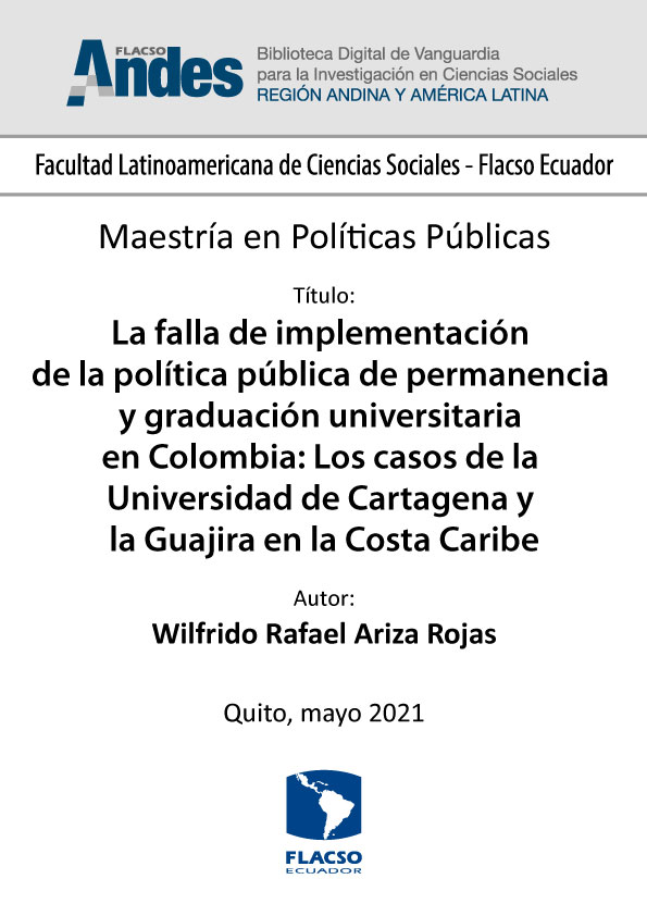 Ariza Rojas, Wilfrido Rafael. 2021. La falla de implementación de la política pública de permanencia y graduación universitaria en Colombia: Los casos de la Universidad de Cartagena y la Guajira en la Costa Caribe. Tesis de maestría, Flacso Ecuador.