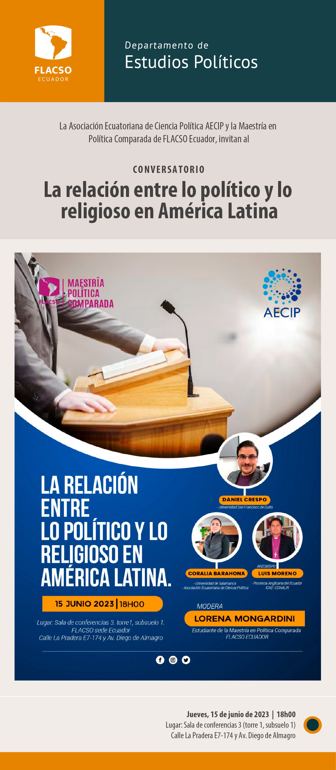 La Asociación Ecuatoriana de Ciencia Política AECIP y la Maestría en Política Compara de FLACSO Ecuador invitan al Conversatorio "La relación entre lo político y lo religioso en América Latina". Con la participación de Daniel Crespo, Coralia Barahona y Luis Moreno, el 15 de junio de 2023 a las 18h00 (hora Ecuador): FLACSO Ecuador, Quito.