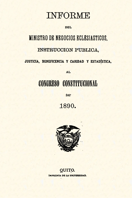 Ministerio de Negocios Eclesiásticos, Instrucción Pública, Justicia, Beneficencia y Caridad y Estadística. 1890. Informe del Ministro de Negocios Eclesiásticos, Instrucción Pública, Justicia, Beneficencia y Caridad y Estadística al Congreso Constitucional de 1890.Quito, Ecuador : Imprenta de la Universidad.