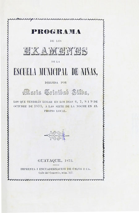 Escuela Municipal de Niñas (Guayaquil). 1873. Programa de los exámenes de la Escuela Municipal de Niñas, dirigida por María Trinidad Silva, los que tendrán lugar en los días 6, 7, 8 i 9 de octubre de 1873, a las siete de la noche en el propio local. Guayaquil, Ecuador : Empresa tipografica i encuadernacion de Calvo i Ca.