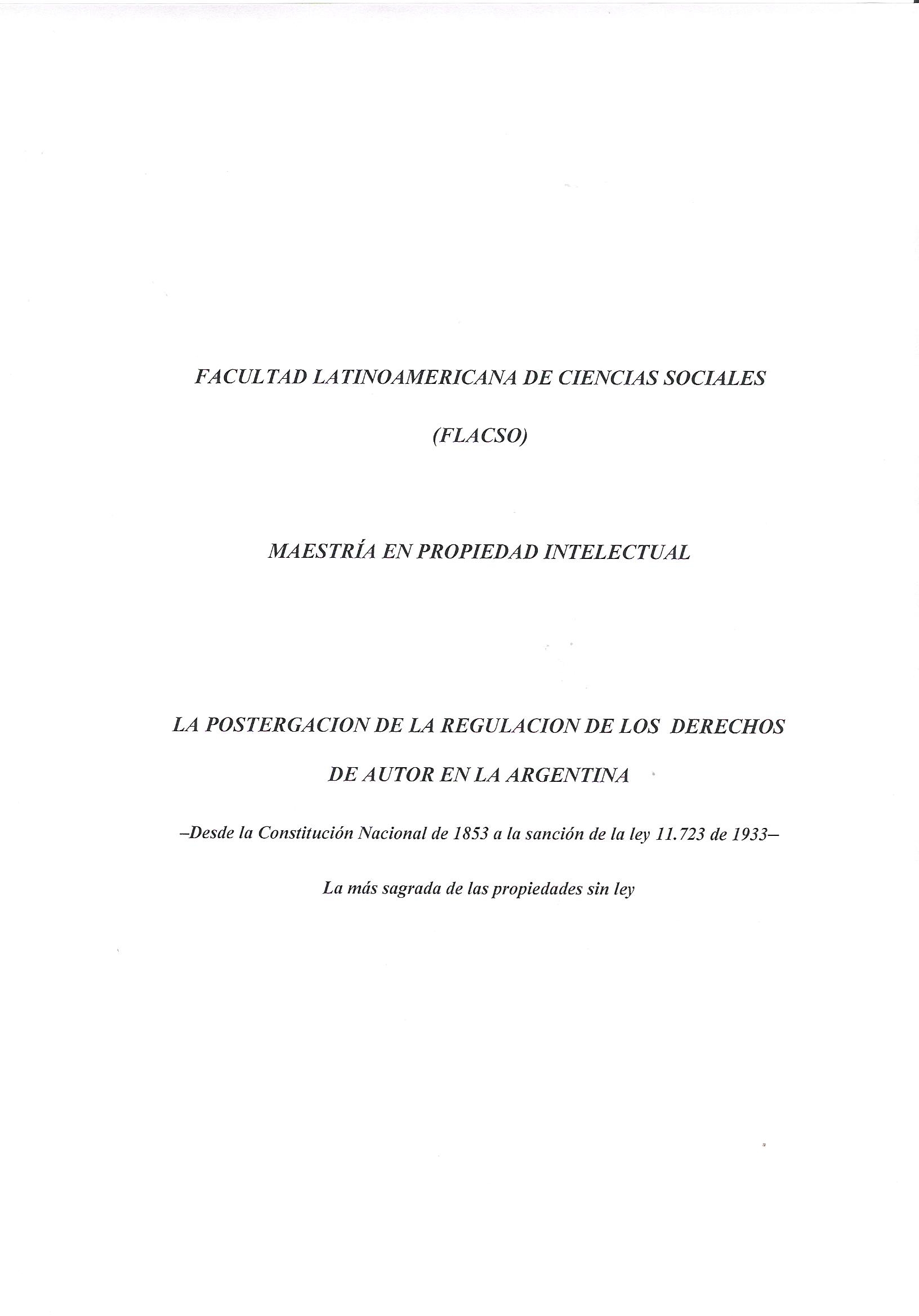 Vidaurreta, Guillermo Esteban (2013). La postergación de la regulación de los derechos de autor en la Argentina : desde la Constitución Nacional de 1853 a la sanción de la ley 11.723 de 1933, la más sagrada de las propiedades sin ley. Tesis de Maestría. FLACSO. Sede Académica Argentina, Buenos Aires.