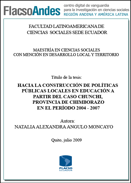 Angulo Moncayo, Natalia Alexandra (2009). Hacia la construcción de políticas públicas locales en educación a partir del caso Chunchi, provincia de Chimborazo en el período 2004-2007. Maestría en Ciencias Sociales con mención en Desarrollo Local y Territorio; FLACSO sede Ecuador. Quito. 125 p.