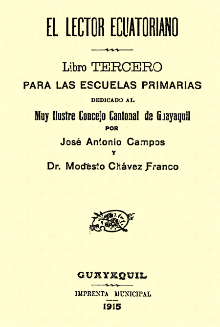 Campos, José Antonio y Chávez Franco, Modesto. 1915. El lector ecuatoriano : libro tercero para las escuelas primarias dedicado al Muy Ilustre Concejo Cantonal de Guayaquil. Guayaquil, Ecuador : Imprenta Municipal.