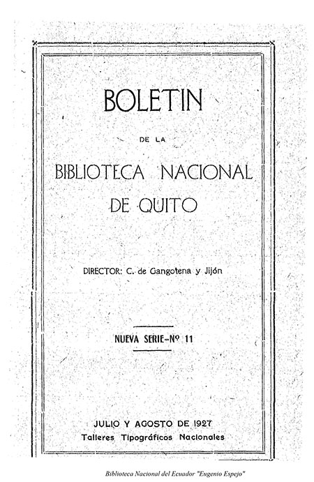 Gangotena y Jijón, Cristobal. 1927. Boletín de la Biblioteca Nacional de Quito. V2. N11. Quito. Talleres Tipográficos Nacionales. 77 p.