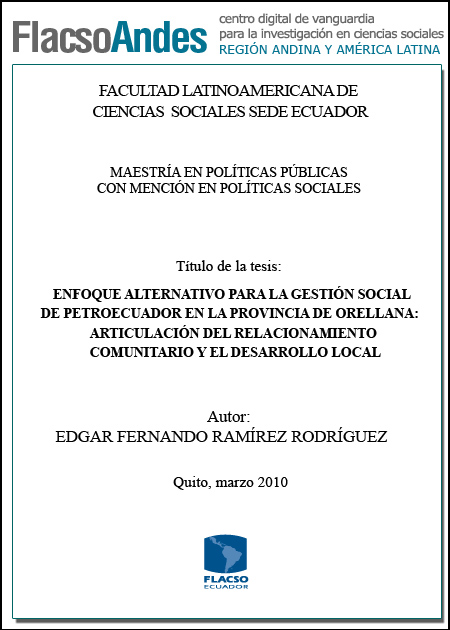 Ramírez Rodríguez, Edgar Fernando (2010). Enfoque alternativo para la gestión social de Petroecuador en la provincia de Orellana: articulación del relacionamiento comunitario y el desarrollo local. Maestría en Políticas Públicas con Mención en Políticas Sociales; FLACSO sede Ecuador. Quito. 104 p.