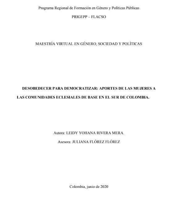 Rivera Mera, Leidy Yohana (2020). Desobedecer para democratizar : aportes de las mujeres a las comunidades eclasiales de base en el sur de Colombia. Tesis de Maestría. FLACSO. Sede Académica Argentina, Buenos Aires.