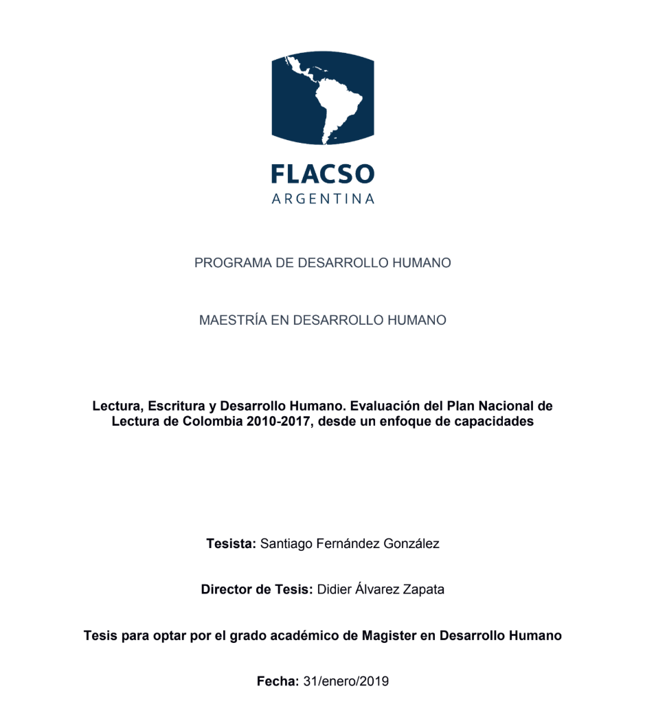 Fernández González, Santiago (2019). Lectura, escritura y desarrollo humano : evaluación del Plan Nacional de Lectura de Colombia 2010-2017, desde un enfoque de capacidades. Tesis de Maestría. FLACSO. Sede Académica Argentina, Buenos Aires.