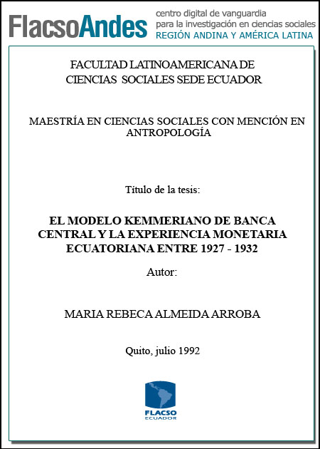 Almeida Arroba, María Rebeca (1992). El modelo Kemmeriano de Banca Central y la experiencia monetaria ecuatoriana entre 1927 y 1932. Maestría en Historia Andina, FLACSO Sede Ecuador. Quito. 189 p.
