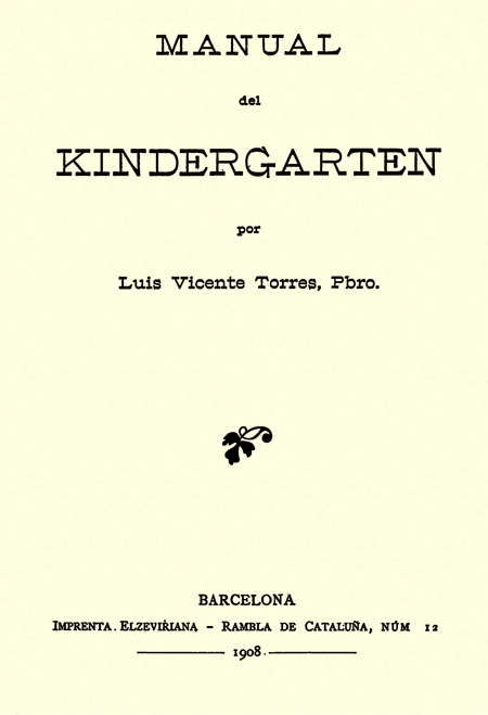 Torres, Luis Vicente. 1908. Manual del Kindergarten. Barcelona, España : Impre4nta Elzeviriana - Rambla de Cataluña, Núm. 12.