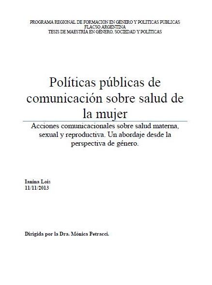 Lois, Ianina Paula (2013). Políticas públicas de comunicación sobre salud de la mujer : acciones comunicacionales sobre salud materna, sexual y reproductiva. Un abordaje desde la perspectiva de género. Tesis de Maestría. FLACSO. Sede Académica Argentina, Buenos Aires.
