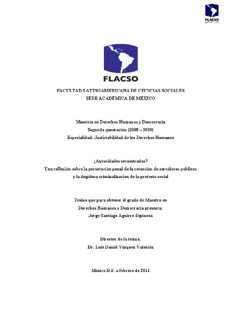 Aguirre Espinosa, Jorge Santiago (2011). ¿Autoridades secuestradas? : una reflexión sobre la persecución penal de la retención de servidores públicos y la ilegítima criminalización de la protesta social. Maestría en Derechos Humanos y Democracia; FLACSO México. México. 67 p.