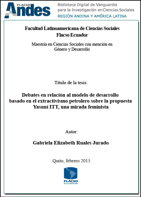 Ruales Jurado, Gabriela Elizabeth. 2015. Debates en relación al modelo de desarrollo basado en el extractivismo petrolero sobre la propuesta Yasuní ITT, una mirada feminista. Tesis de maestría, Flacso Ecuador.