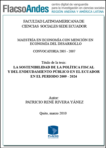 Rivera Yánez, Patricio René (2010). La sostenibilidad de la política fiscal y el endeudamiento público en el Ecuador en el período 2009-2024. Maestría en Economía del Desarrollo. FLACSO, Sede Ecuador. Quito. vii, 152 p.