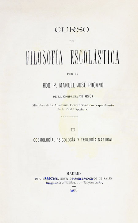 Proaño, Manuel José. 1893. Curso de Filosofía Escolástica por el Rdo. P. Manuel José Proaño de la Compañía de Jesús, Tomo II. Madrid, España: Imp. de la Soc. Edito. De San Francisco de Sales.