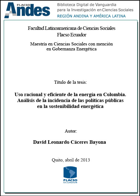 Cáceres Bayona, David Leonardo. 2013. Uso racional y eficiente de la energía en Colombia: análisis de la incidencia de las políticas públicas en la sostenibilidad energética. Tesis de maestría, Flacso Ecuador.